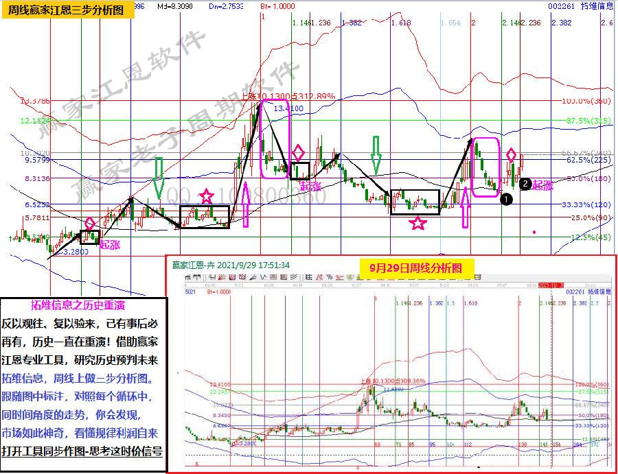 拓維信息,周線上做三步分析圖。跟隨圖中標(biāo)注,對照每個循環(huán)中,同時間角度的走勢,你會發(fā)現(xiàn),市場如此神奇,看懂規(guī)律利潤自來打開工具同步作圖-思考這時價信號!