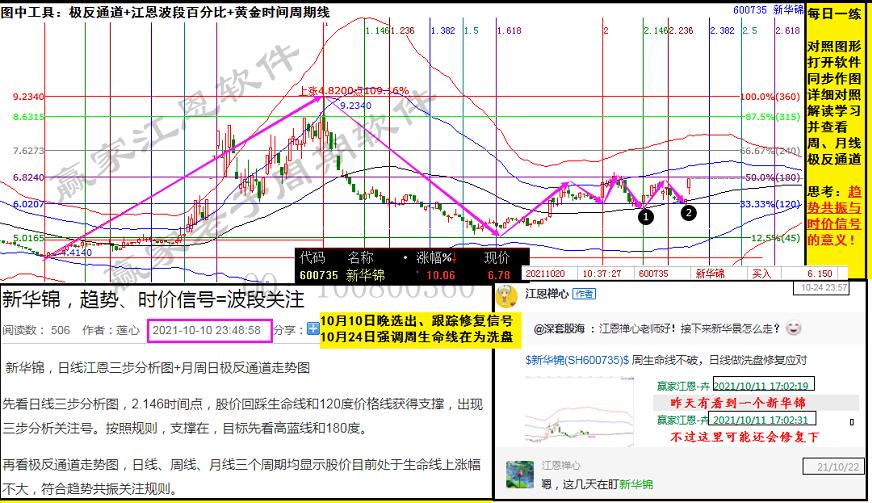 新華錦,按照模型10月10日選出。按照規(guī)則跟蹤修復(fù)信號(hào),強(qiáng)調(diào)周生命線在即為洗盤(pán),貼生命線建倉(cāng),今日計(jì)提漲停。漲停重要,漲停背后的條件更重要。打開(kāi)軟件,同步作圖學(xué)習(xí),對(duì)照解讀逐條理解,在每天的實(shí)戰(zhàn)應(yīng)用中掌握江恩實(shí)戰(zhàn)技法?!?.趨勢(shì)共振:日周月均在極反通道生命線上;2.時(shí)價(jià)信號(hào):時(shí)間點(diǎn)確認(rèn)價(jià)格位給出轉(zhuǎn)勢(shì)信號(hào)?!俊 ?/p>