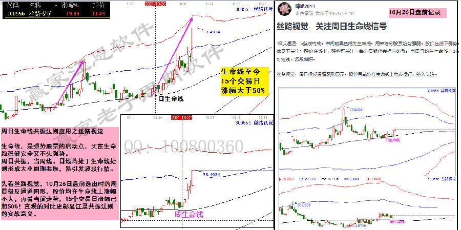 先看絲路視覺(jué),10月26日盤(pán)前選出時(shí)的周日極反通道圖形,股價(jià)均在生命線上漲幅不大;再看當(dāng)前走勢(shì),15個(gè)交易日漲幅已超50%!直觀的對(duì)比更彰顯江恩共振法則的實(shí)戰(zhàn)意義。