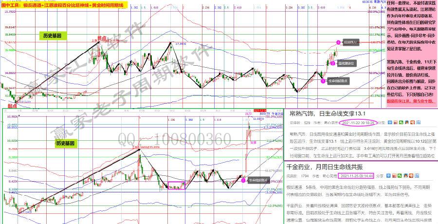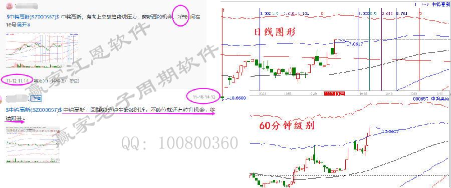 中鎢高新,里邊運(yùn)用到了一個經(jīng)常講的知識點,12號選出,15號攻擊藍(lán)色上軌線失敗回踩,按照之前講過的知識點,當(dāng)個股上攻藍(lán)色上軌線回落,就要結(jié)合60分鐘生命線判斷是洗盤還是趨勢上攻結(jié)束。16號回踩60分鐘生命線位置,且也到了前面分析講的日線2倍時間變盤點。企穩(wěn)反轉(zhuǎn)拉升,今天漲停突破藍(lán)色上軌線,進(jìn)入新的空間。一旦站穩(wěn)藍(lán)色上軌線,目標(biāo)就是紅色上軌線。只要能看懂了,這一波的利潤就不會錯過。這就是江恩周期之間的關(guān)系的具體用法,大周期制約小周期,小周期引導(dǎo)大周期。