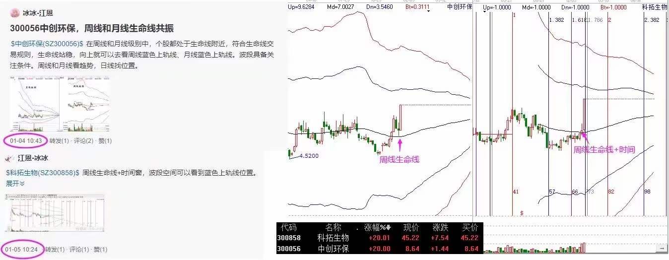 當(dāng)股價月線,周線,都處于生命線附近的時候,同時,日線也處于生命線附近,這就形成了長期,中期,短期的趨勢共振,這就是一個非常好的建倉買入信號。據(jù)此篩選出的中創(chuàng)環(huán)保、科拓生物,今天雙雙20c封板漲停。我們無法決定市場會怎么走,能做的只有提升自己的理解,在符合操作的買點(diǎn)買入,在符合賣出的信號賣出,僅此而已,江恩理論體系,幫助大家提前做市場預(yù)判,并利用江恩規(guī)則去進(jìn)行跟隨。這就足矣。