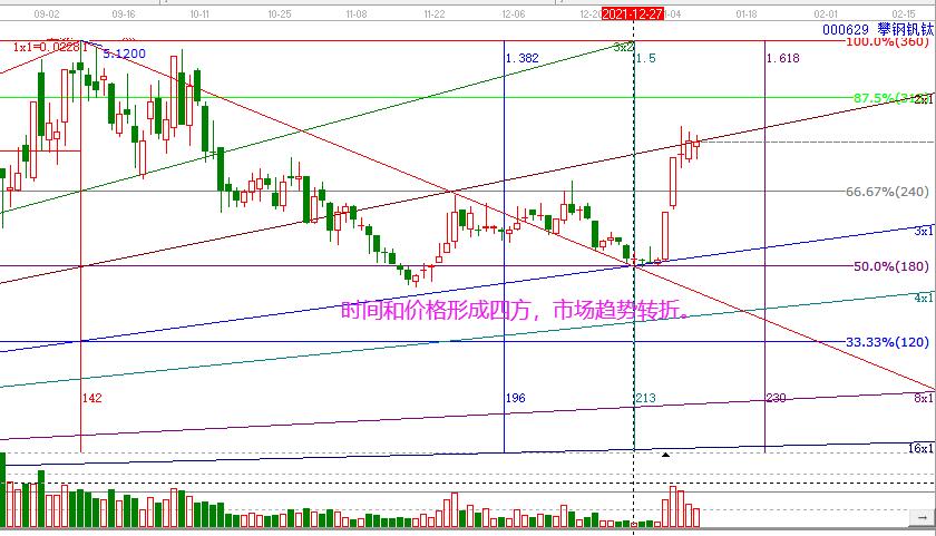 12月27日時間窗口,股價到達(dá)180度分割位支撐,時間+價格,形成四方,市場轉(zhuǎn)勢迫在眉睫,這是一個標(biāo)準(zhǔn)的時價四方信號,可借鑒學(xué)習(xí)。