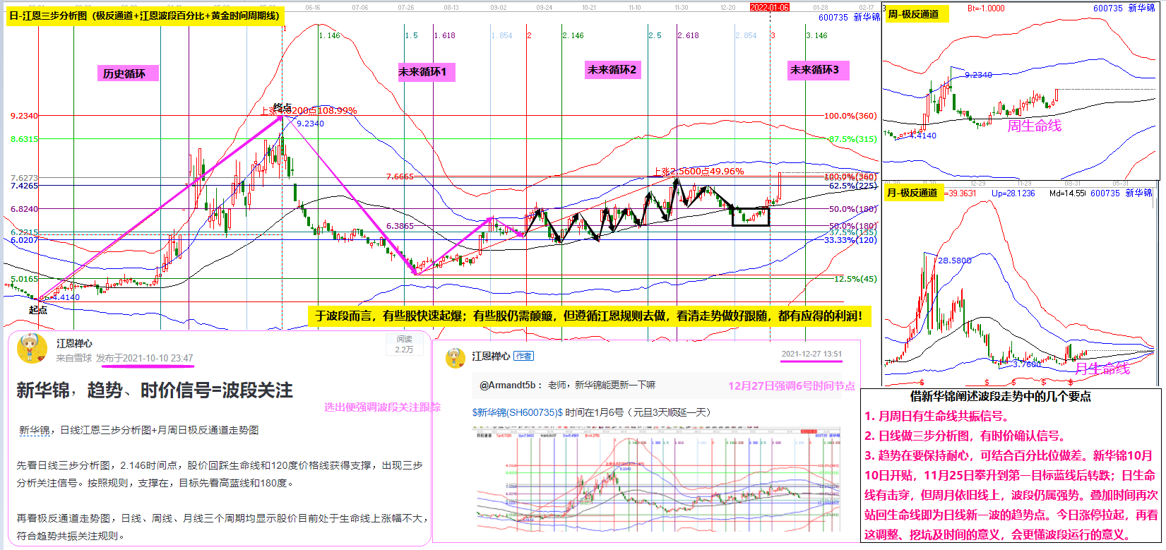 新華錦10月10日開(kāi)貼,11月25日攀升到第一目標(biāo)藍(lán)線后轉(zhuǎn)跌;日生命線有擊穿,但周月依舊線上,波段仍屬?gòu)?qiáng)勢(shì)。疊加時(shí)間再次站回生命線即為日線新一波的趨勢(shì)點(diǎn)。今日漲停拉起,再看這調(diào)整、挖坑及時(shí)間的意義,會(huì)更懂波段運(yùn)行的意義。于波段而言,有些股走勢(shì)凌厲,信號(hào)出現(xiàn)快速起爆;有些股走勢(shì)顛簸,但遵循江恩規(guī)則去做,看清走勢(shì)做好跟隨,都會(huì)有贏得的利潤(rùn)。