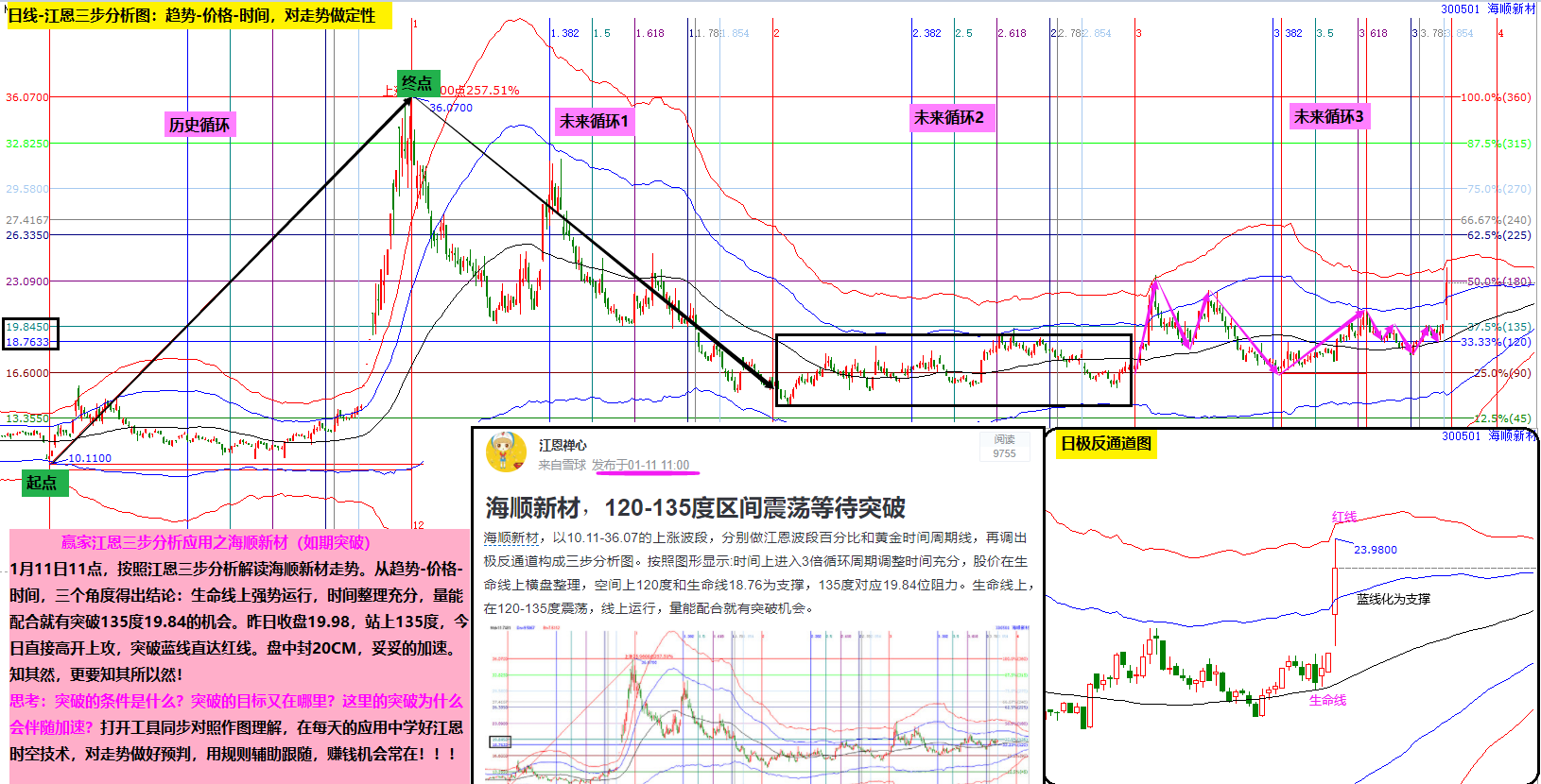 1月11日11點(diǎn),按照江恩三步分析解讀海順新材走勢(shì)。從趨勢(shì)-價(jià)格-時(shí)間,三個(gè)角度得出結(jié)論:生命線上強(qiáng)勢(shì)運(yùn)行,時(shí)間整理充分,量能配合就有突破135度19.84的機(jī)會(huì)。昨日收盤(pán)19.98,站上135度,今日直接高開(kāi)上攻,突破藍(lán)線直達(dá)紅線。盤(pán)中封20CM,妥妥的加速。