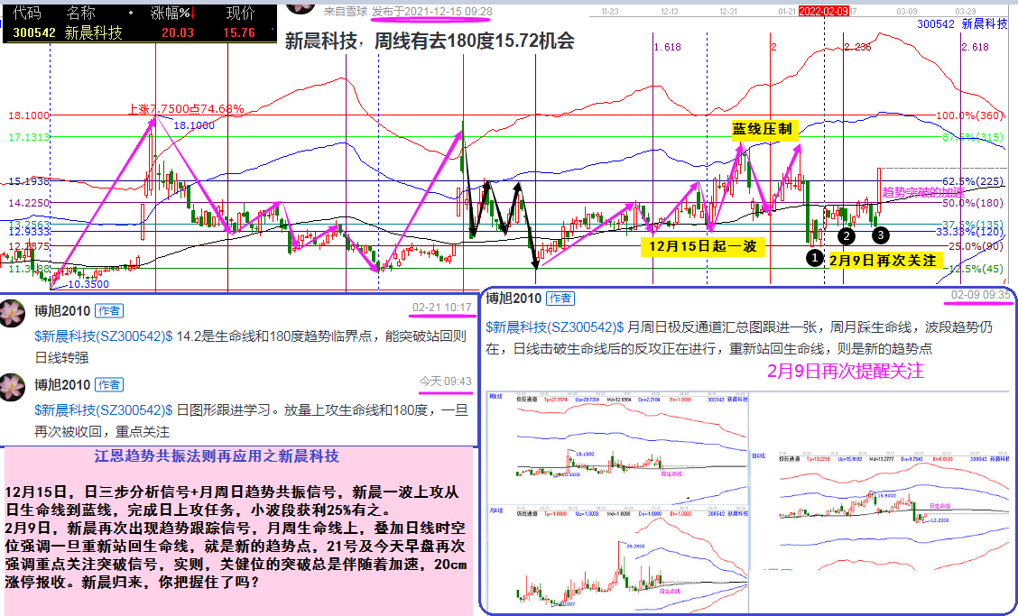 2月9日,新晨再次出現(xiàn)趨勢(shì)跟蹤信號(hào),月周生命線上,疊加日線時(shí)空位強(qiáng)調(diào)一旦重新站回生命線,就是新的趨勢(shì)點(diǎn),21號(hào)及今天早盤(pán)再次強(qiáng)調(diào)重點(diǎn)關(guān)注突破信號(hào),實(shí)則,關(guān)健位的突破總是伴隨著加速,20cm漲停報(bào)收。新晨歸來(lái),知道如何把握了嗎?