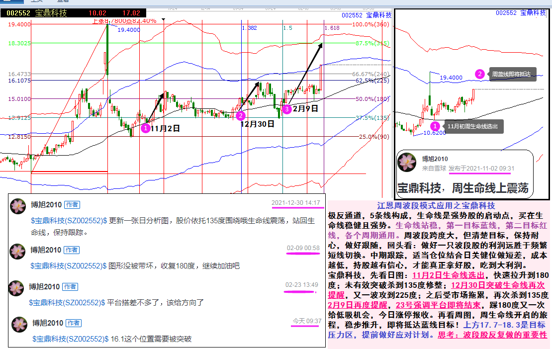 寶鼎科技,先看日?qǐng)D:11月2日生命線選出,快速拉升到180度;未有效突破殺到135度修整;12月30日突破生命線再次提醒,又一波攻到225度;之后受市場(chǎng)拖累,再次殺到135度2月9日再度提醒,23號(hào)強(qiáng)調(diào)平臺(tái)即將結(jié)束,踩180度又一次給低吸機(jī)會(huì),今日漲停報(bào)收。再看周圖,周生命線開(kāi)啟的旅程,穩(wěn)步推升,即將抵達(dá)藍(lán)線目標(biāo)!上方17.7-18.3是目標(biāo)壓力區(qū),提前做好應(yīng)對(duì)計(jì)劃。思考:波段股反復(fù)做的重要性!