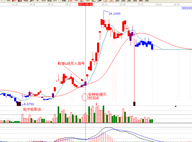 一:首先是趨勢,趨勢工具乾坤k線,依據(jù)乾坤k線操作法則,(乾坤k線,有兩條線,關(guān)注線,出局線,三種顏色,藍(lán)色休息區(qū),紫色關(guān)注區(qū),紅色持股區(qū),)300262 , 5月30日再次站上關(guān)注線,紫色變紅色,上穿關(guān)注線,是加倉或進(jìn)場的時機(jī)。(如下圖)