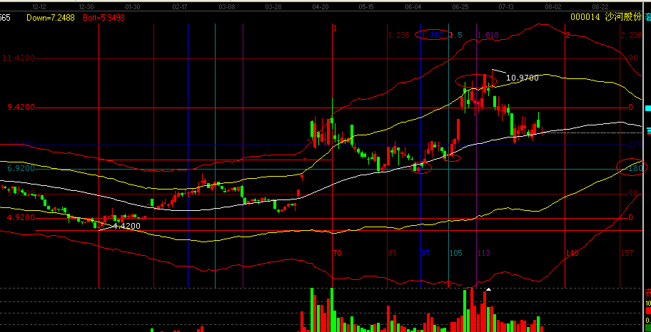 第二:時間分析,黃金時間周期線,提示,000014, 6月6日為黃金時間周期的1.382的時間變盤時間,(用法:選擇一個波段的低點,和高點的連線,我們選擇2012年1月6日的低點為起點,2012年4月26日為終點,連線作圖)