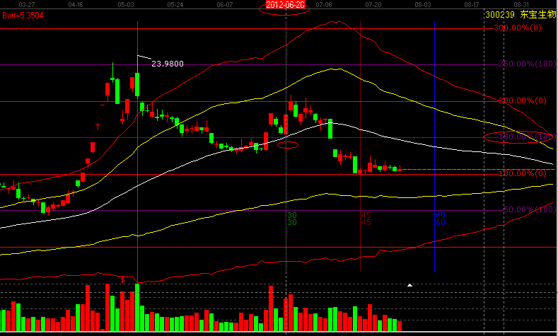 第三:價格分析:江恩價格百分比,300239,6月26日、縮量回落在江恩價格百分比180度支撐線獲得支撐,(畫法,選擇一個波段的高點,或者低點,拖動鼠標即可,我們選擇2012年1月6日的低點為起點,作圖)