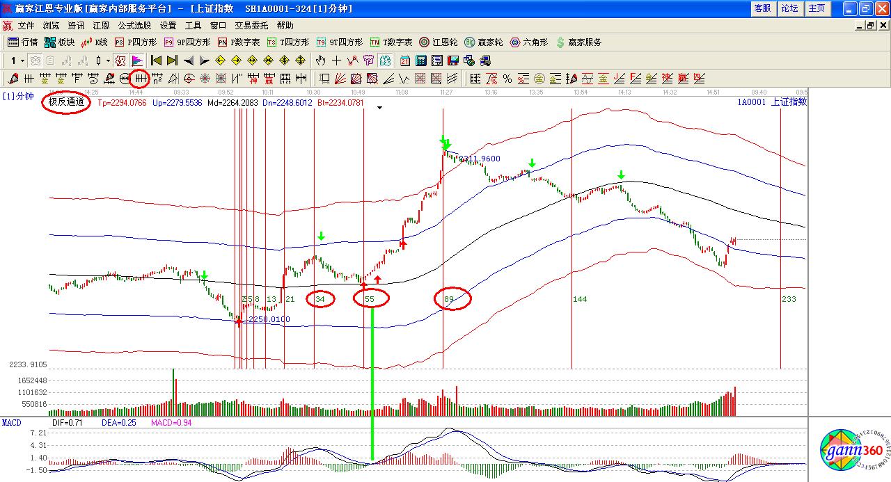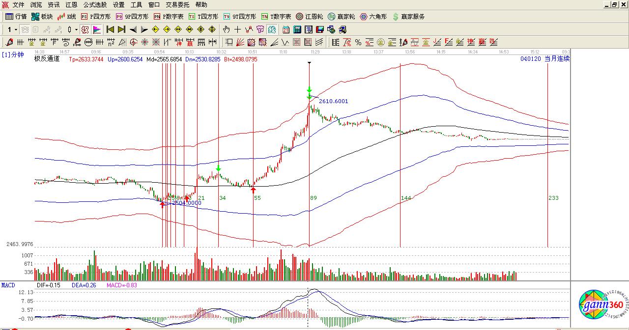 股指期貨在2013-03-15日9.55分見(jiàn)底2504.00遇到極反通道下軌位置,按照江恩規(guī)則上一次2013-14日09.15分低點(diǎn)2505.2點(diǎn)附近是一個(gè)絕佳的買點(diǎn)。這個(gè)買點(diǎn)也符合贏家極反通道的絕佳位置買點(diǎn)介入之后就開(kāi)起了一波5分鐘的連續(xù)拉升,剛好是5時(shí)間周期,回調(diào)到8沒(méi)有止跌信號(hào),在13時(shí)間窗口震蕩盤整后開(kāi)啟了一波快速上行直接過(guò)21時(shí)間更為神奇的是股指期貨在22時(shí)間調(diào)整稍作休息后再一次創(chuàng)出新高這里距離34時(shí)間很近,而指標(biāo)macd給出背離的信號(hào)賣出按照江恩法則,一波快速上行后在新高力度時(shí)間將發(fā)生轉(zhuǎn)折。在其34時(shí)間快速殺跌殺跌到55時(shí)間窗口,這里1分鐘指標(biāo)再一次底背離發(fā)出買的信號(hào),時(shí)間也到,極反通道生命線也到,前期的時(shí)間高低點(diǎn)超級(jí)符合,這樣就預(yù)示著一波大的行情即將來(lái)臨,隨之的是指標(biāo)macd在0軸金叉也更充分的說(shuō)明了這一點(diǎn)。連續(xù)的陽(yáng)線也更加肯定了這個(gè)推斷,直接看下一個(gè)時(shí)間89時(shí)間,這里距離上午收盤時(shí)間也是極反通道紅色外軌道線的壓力量能出現(xiàn)3次背離,預(yù)示著行情的一個(gè)反轉(zhuǎn)隨之而來(lái)的就是一波緩慢下跌行情。而這些完全可以用江恩理論去解釋這一切,如果不明白就把江恩華爾街45年多看2遍。那么你就會(huì)知道為什么2504.00附近是一個(gè)很安全的買點(diǎn)了