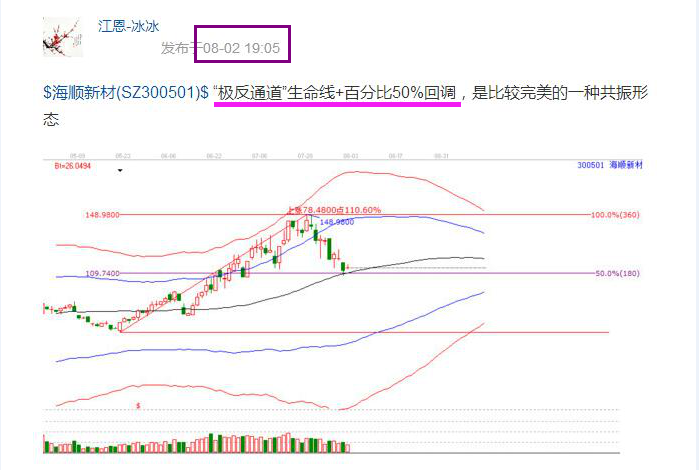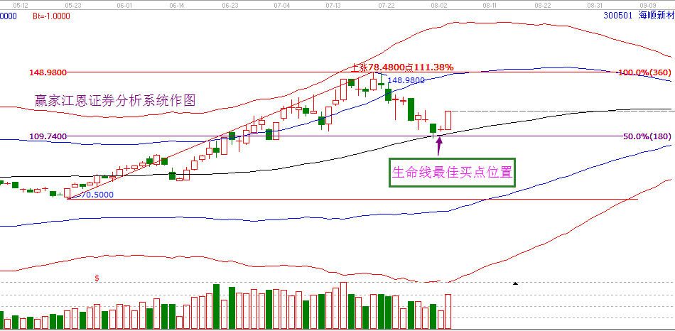 2.工具解析:在經(jīng)歷半個月調(diào)整,股價回調(diào)至前一波上漲的50%位置,在109.80獲得支撐,在江恩理論的12條買賣規(guī)則中,規(guī)則3為按百分比買賣。而其中,最重要的分割位在50%的位置,個股回調(diào)到50%,或是反彈到50%的位置,就是需要加以重視的位置。這只股票在圖形中,從上往下回調(diào)到50%的位置,獲得了重要的支撐。同時,個股也處于極反通道生命線的位置,按照極反通道操作規(guī)則,個股在生命線位最佳買點。另個不同的工具在同一個位置出現(xiàn)支撐,在8月1日和8月2號就形成了重要的買點。
