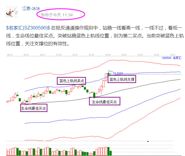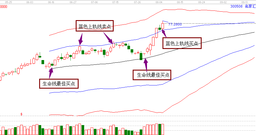 2.工具解析:按照極反通道操作規(guī)則,站穩(wěn)一線看高一線,跌破一線看低一線。極反通道中生命線位最佳買點(diǎn),生命線買進(jìn)之后,目標(biāo)位看高一線就是藍(lán)色上軌線位置,如果藍(lán)色上軌線不能有效突破,則成為賣點(diǎn),如果有效突破并能站穩(wěn)藍(lán)色上軌線,那么就會(huì)形成新的買點(diǎn)位置,即藍(lán)色上軌線買點(diǎn)。名家匯在8月3日漲停突破藍(lán)色上軌線,然后在4日回踩站穩(wěn)藍(lán)色上軌線位置,確認(rèn)支撐,因此8月5日就形成了買點(diǎn)。