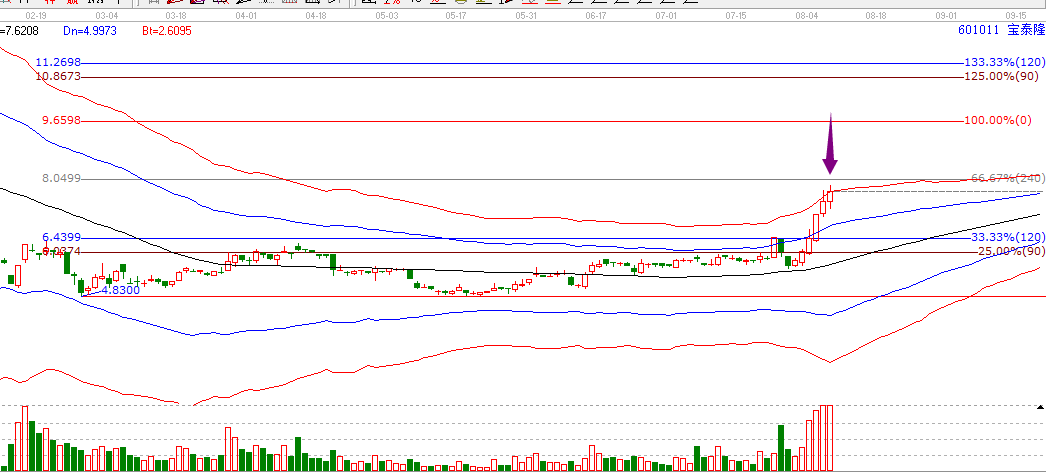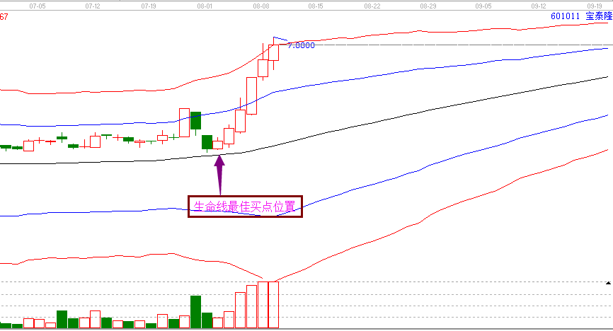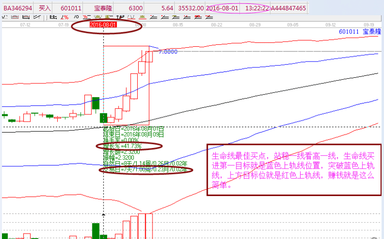 2.圖形解析:在極反通道操作規(guī)則中,生命線是強(qiáng)勢(shì)和弱勢(shì)的區(qū)分線。處于極反通道生命線上,則為強(qiáng)勢(shì);反之,處于生命線下則為弱勢(shì)。而在強(qiáng)勢(shì)區(qū)域的個(gè)股,買點(diǎn)位置在每一條線的支撐位附近。即生命線支撐位的位置以及藍(lán)色上軌線支撐的位置。寶泰隆在8月1日回踩極反通道生命線位置,形成了生命線最佳的買點(diǎn)位置。因此在8月1日回踩生命線的時(shí)候開始操作。