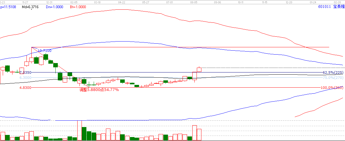 但在日線周期中,短時(shí)間需要關(guān)注價(jià)格百分比66.67%的阻力位,即8.05。