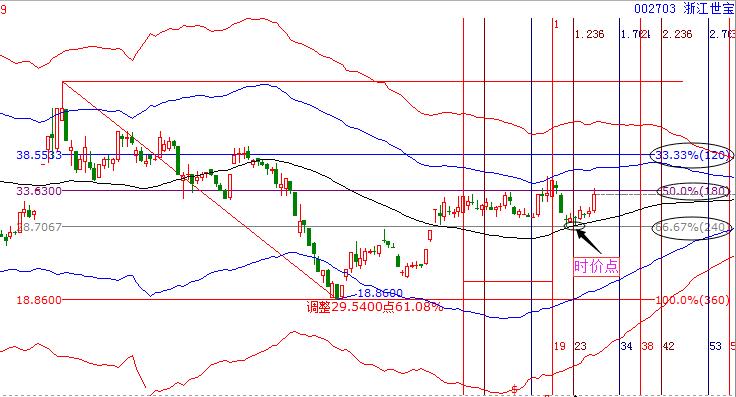 2.工具解析:先看極反通道,市場(chǎng)在6月23日,漲停突破生命線,其后回踩后繼續(xù)拉升,再次到達(dá)藍(lán)色線后回落,目前再次調(diào)整到生命線附近,整個(gè)波動(dòng)符合極反通道的“一線站穩(wěn),看高一線;一線過(guò)不去,回調(diào)一線”的操作規(guī)則。同時(shí)結(jié)合價(jià)格工具可以發(fā)現(xiàn)市場(chǎng)的趨勢(shì)強(qiáng)勢(shì),同時(shí),6月24日生命線與價(jià)格工具的240度形成了價(jià)格上的共振,構(gòu)成了一個(gè)階段的買點(diǎn);而在8月4日時(shí)間窗口附近,市場(chǎng)再次回落到生命線與240度支撐共振位,時(shí)間與價(jià)格形成共振,價(jià)格與價(jià)格形成共振,因此在8月4日前后,是該股的最佳買入位置,其短期的壓力位則是180度位置的33.63附近,突破看高到藍(lán)色線附近。