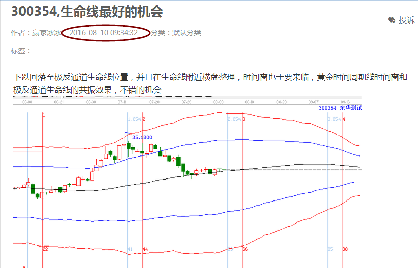 2.江恩工具分析共振:贏家聊吧在8月10日發(fā)布300354相關(guān)分析貼。時(shí)間窗和極反通道生命線形成共振。形成了操作的條件,然后回調(diào)了兩天時(shí)間,在群里有跟蹤分析,關(guān)注25.46的支撐有效性,經(jīng)過(guò)調(diào)整確認(rèn),回踩在支撐位止跌,正是開(kāi)始上漲。
