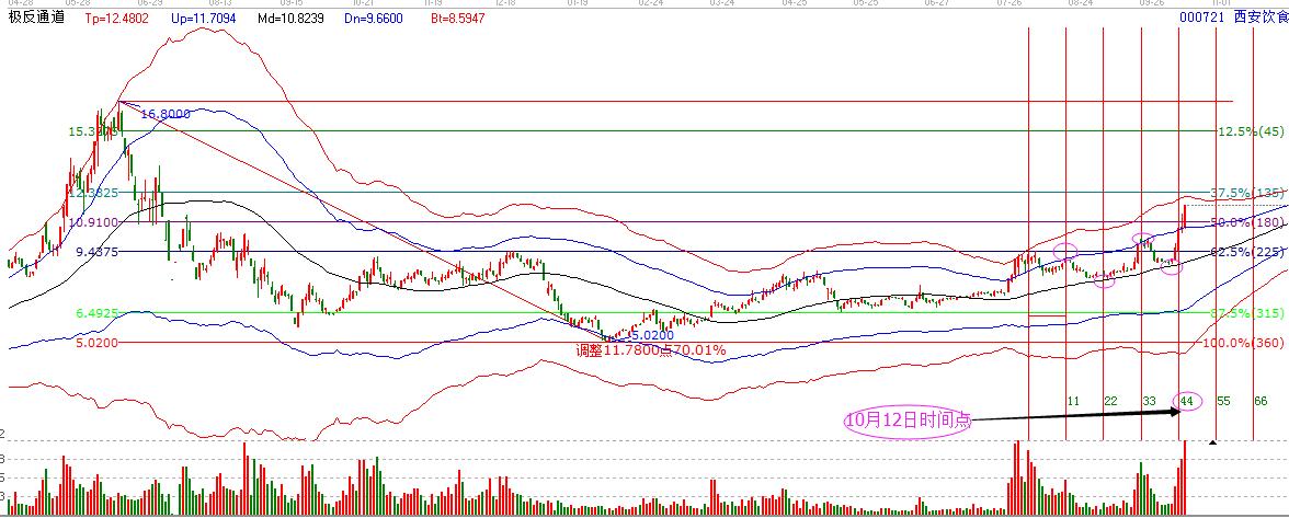 2.工具解析:市場(chǎng)在9月20日高點(diǎn)回落后,在生命線附近止跌開始反彈,并很快展開快速的拉升,于10月12日時(shí)間點(diǎn)漲停突破藍(lán)色線,市場(chǎng)的走勢(shì)完全按照極反通道來運(yùn)行,完全符合一線站穩(wěn),看高一線,一線跌破,看低一線的操作要求。所以,在市場(chǎng)縮量回踩到生命線附近的時(shí)候,果斷買入。