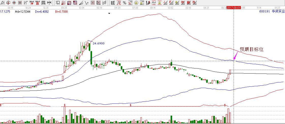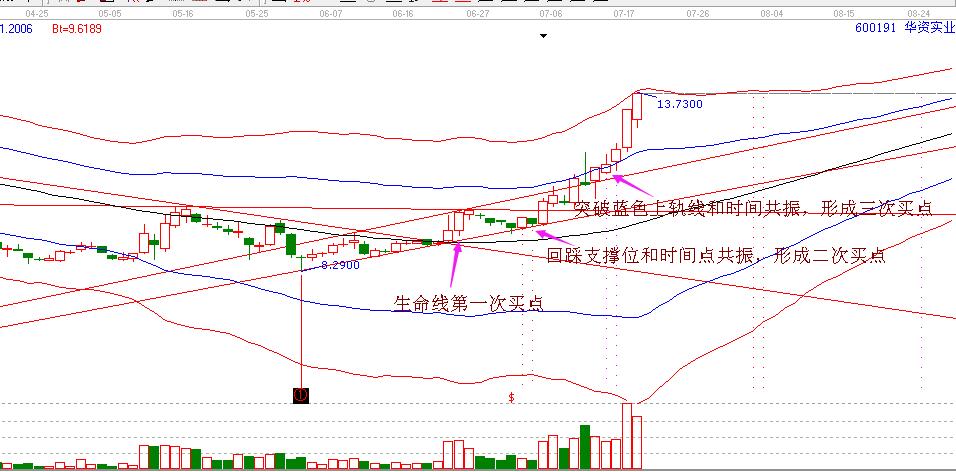 在上面的圖形中,個(gè)股在拉升過(guò)程中,有幾次的調(diào)整,我們可以看到在第一次從生命線開(kāi)始上漲時(shí),個(gè)股壓力位調(diào)整,回踩支撐位附近和輪中輪變盤點(diǎn)的時(shí)間窗共振,時(shí)間和支撐位共振形成二次買點(diǎn)。然后再次開(kāi)啟拉升,一路向上突破極反通道藍(lán)色上軌線位置,再次和輪中輪變盤點(diǎn)的時(shí)間窗共振,形成了三次買點(diǎn)。按照極反通道操作規(guī)則,站穩(wěn)一線看高一線,生命線啟動(dòng),第一目標(biāo)位就是藍(lán)色上軌線位置,突破藍(lán)色上軌線,第二目標(biāo)位就是紅色上軌線位置。按照這樣的分析,步步為營(yíng),不好高騖遠(yuǎn),只要趨勢(shì)不變就可以持續(xù)持股,因此咱們贏家才能安心的持股華資實(shí)業(yè)至當(dāng)下。