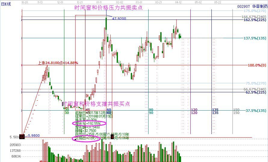 江恩語錄:當價格和時間形成四方形,市場轉勢便迫在眉睫。簡單直觀的用圖形來講,就是時間和價格形成共振,價格在重要的支撐位或是阻力位,時間窗到達,最終形成合力,促使趨勢向上或是向下反轉。因此,價格支撐+時間窗的時價共振就是完美的擒妖模型。贏家江恩利用時價共振成功華森制藥、萬興科技斬獲兩只大妖,詳情如下。