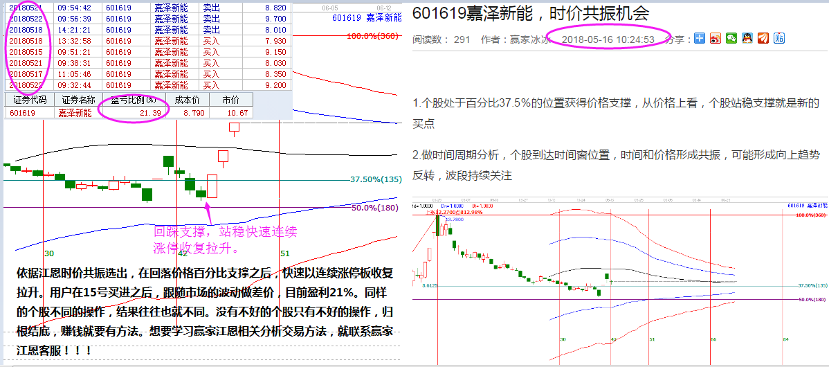 嘉澤新能,5月15號依據(jù)江恩時價共振選出,用戶同步參與,贏家聊吧16號發(fā)布,參與之后回落江恩價格百分比50%重要支撐位,止跌并快速以連續(xù)漲停板收復拉升。用戶在15號買進之后,跟隨市場的波動在止跌企穩(wěn)之后聯(lián)系做差價降低成本,目前盈利21%。