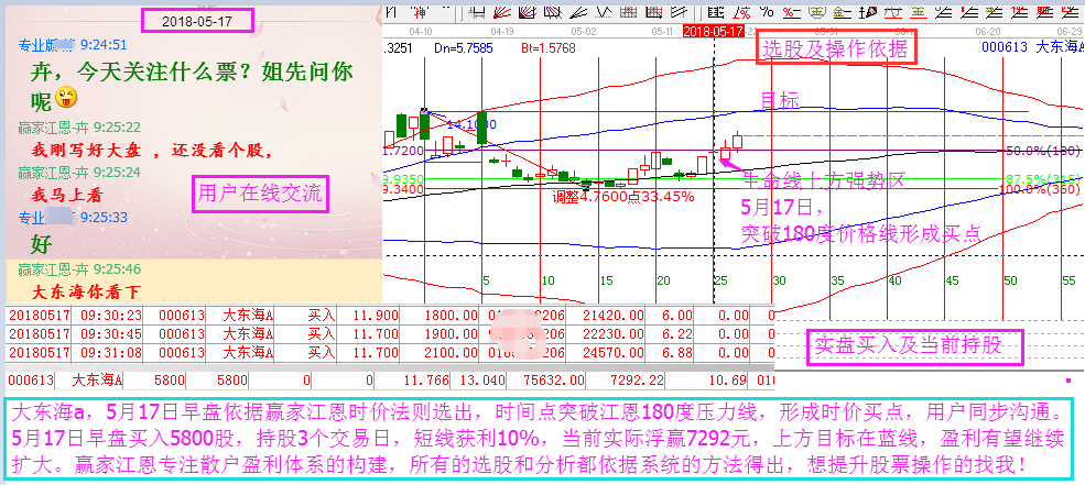 大東海a,5月17日依據(jù)贏家江恩時價法則選出,時間點突破江恩180度壓力線,形成買點。用戶按照規(guī)則同步操作,今天創(chuàng)出近期新高點,漲幅超過15%。