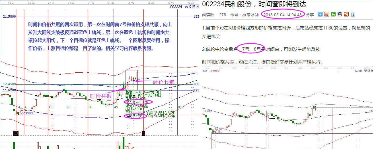 民和生物,5月4號,個股在K線價格四方形180度位置獲得價格支撐,同時依據(jù)輪中輪變盤點做時間周期分析也到達時間變盤點,時間和價格支撐形成時價共振,符合時價共振操作規(guī)則選出,截止14號高點,7個交易日,22%漲幅。