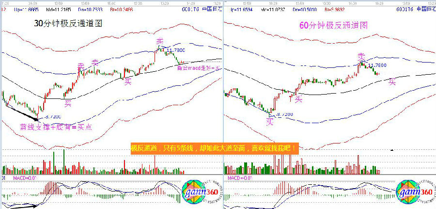 1、趨勢(shì)上,當(dāng)前股價(jià)跌落到極反通道藍(lán)色下軌線支撐處,符合藍(lán)線保守型買點(diǎn);