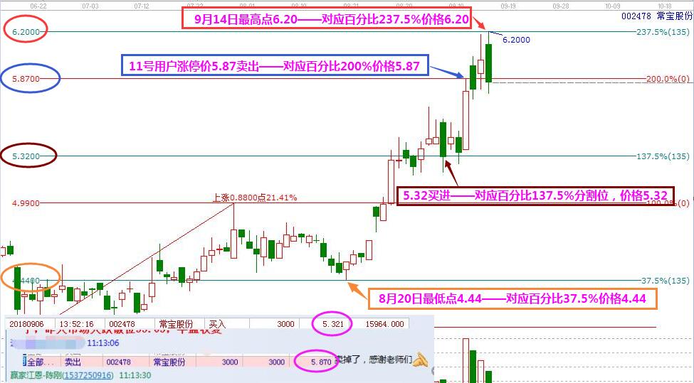 用戶結合軟件給出的時間以及價格分析,在6號當天5.32買進,耐心持股等待,然后個股如期在時間窗11號啟動且盤中拉漲停,按照百分比線站穩(wěn)一線看高一線交易規(guī)則,當天137.5%啟動,拉升目標位就是200.0%分割位,對應價格5.87,再看11號常寶股份漲停最高價剛好就是5.87,點位分毫不差。個股已經(jīng)到達壓力位,用戶在5.87漲停價短線獲利了結,獲利10%+。一個點位精準可以說是巧合,那我們繼續(xù)看。個股在突破百分比200%分割位之后,下一個上漲目標位就是百分比線237.5%分割位,對應價格6.20,而14號的最高點恰恰就是6.20,又一次分毫不差。最后我們再看本輪上漲的啟動點位置,個股從前面高點回落之后在百分比37.5%分割位,對應價格4.44止跌,繼而開啟一路拉升行情,再回顧8月20日當天最低點價格正好是4.44,依然是分毫不差。