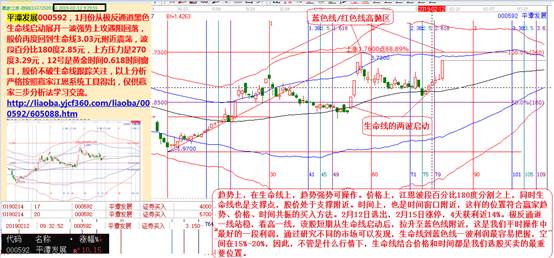 下面介紹下本周操作的一個股票平潭發(fā)展(000592),該股是符合贏家三步分析法的,首先趨勢上,在生命線上,趨勢強勢可操作。價格上,江恩波段百分比180度分割之上,同時生命線也是支撐點,股價處于支撐附近。時間上,也是時間窗口附近,這樣的位置符合贏家趨勢、價格、時間共振的買入方法。2月12日選出,2月15日漲停,4天獲利近14%。極反通道一線站穩(wěn),看高一線,該股短期從生命線啟動后,拉升至藍色線附近,這是我們平時操作中最好的一段利潤,通過研究不同的市場可以發(fā)現(xiàn),生命線到藍色線一波利潤最容易把握,空間在15%-20%,因此,不管是什么行情下,生命線結(jié)合價格和時間都是我們選股買賣的最重要位置。
