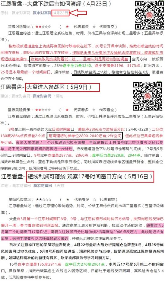 大盤五一節(jié)后的反彈,在5月17日時間窗口宣告結(jié)束。贏家江恩從4月22日盤中明確提示風險,到等待5月8日-9日時間窗口備戰(zhàn)交易,并于2800-2840區(qū)間進行短線抄底建倉,到5月17日2966點附近見頂回落。投資者再次經(jīng)歷了一次市場的完美漲跌,從0到360度完成一個漲跌循環(huán)。對于市場的判斷,贏家大勢分析都有展示,在此我們做下回顧。