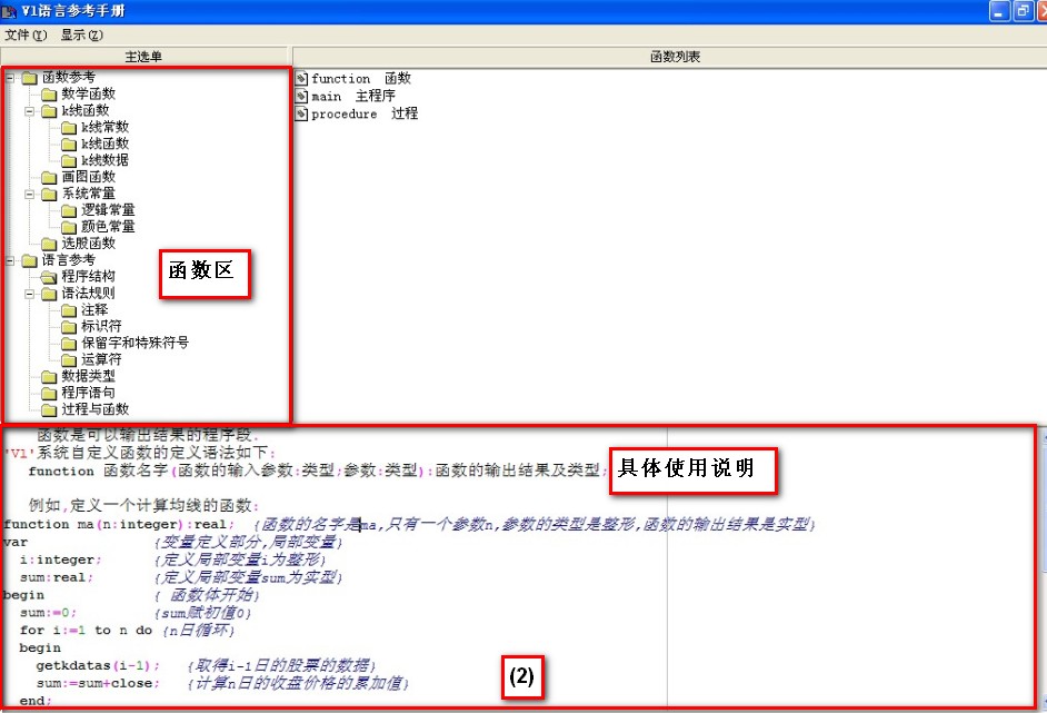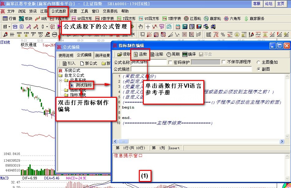 贏家江恩股票軟件函數(shù)如何查看?在進(jìn)入到軟件之后,點(diǎn)擊最上面的一欄中的公式選股,選擇下面的公司管理,雙價(jià)打開(kāi)指標(biāo)制作編輯,然后在彈出的對(duì)話框中單擊函數(shù)打開(kāi)VI語(yǔ)言參考手冊(cè)沒(méi)然后我們就可以看到顯影的函數(shù)區(qū),以及具體的使用說(shuō)明。當(dāng)然通過(guò)文字不方便大家的記憶,下面就是客服人員為大家整理的相應(yīng)的圖片步驟,幫助大家的記憶。