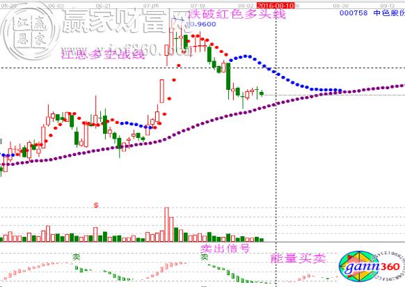 如圖,000758中色股份,在10.96的高點(diǎn)處,極反通道剛好運(yùn)行到紅色外軌線的波段壓力,上漲趨勢(shì)受阻應(yīng)賣出為主;同時(shí),江恩多空展現(xiàn)工具跌破短線多頭線,趨勢(shì)轉(zhuǎn)弱;再看下方的能量買賣,紅柱縮短出現(xiàn)賣出信號(hào)。3個(gè)趨勢(shì)工具都顯示10.96處的上漲趨勢(shì)告一段落,空頭占優(yōu),理應(yīng)賣出為主;而當(dāng)前極反通道回撤到生命線支撐附近,多空戰(zhàn)線回撤到紫色多頭線的支撐,而能量買賣綠柱縮短,趨勢(shì)都在顯示走好,則應(yīng)做分批買入。
