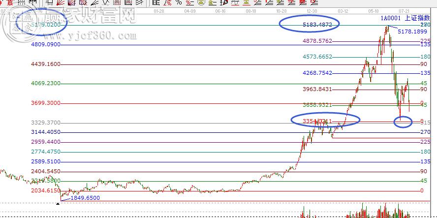如上證指數(shù)分析圖。我們選取K線價(jià)格四方形這個江恩特色價(jià)格工具,分別以1849和3049兩個重要低點(diǎn)作為起點(diǎn),步長采用起點(diǎn)縮小十倍作圖如下。可以看到1849出發(fā)的180度落在了5179,而3049出發(fā)的270度落在了5183,兩者都同時(shí)顯示5180附近是重要的壓力區(qū),兩組循環(huán)的重要角度疊加共振——5178頂部形成,必須高拋,換來了一路暴跌!自5178的暴跌在下方315度和0度相交的位置3354附近形成支撐帶,而實(shí)際市場在3373點(diǎn)展開了反彈。