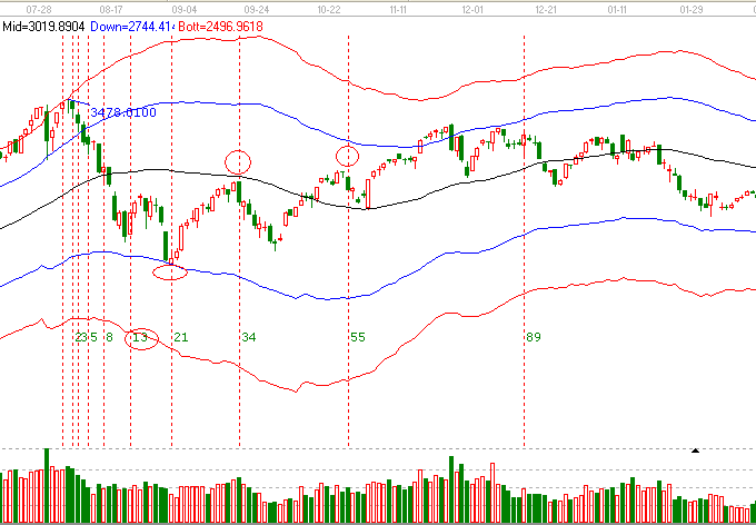 以上證指數(shù)為例,對此工具的畫法做一個演示。首先我們要用鼠標(biāo)選中費氏時間循環(huán)線這個工具的圖標(biāo),點擊左鍵,我們在選點的過程中可以根據(jù)個人的經(jīng)驗來選擇它的點位,高點或者是低點,那么我下面就選擇一下這個一個小波段的高點,2009年8月4號這一天點位3478點),這個工具的操作也是很簡單的,點擊鼠標(biāo)左鍵,在你選擇起點的這個位置即可,我們可以看一下,費氏時間循環(huán)線,它是以費波納奇神奇數(shù)字排開的,1,2,3,5,8、13、21,一只向后延伸。那么以前我們有講過,如果幾個同等重要的時間點位形成共振的情況下,下一條所提示的時間點位就為重要的時間之窗,應(yīng)該給予關(guān)注。