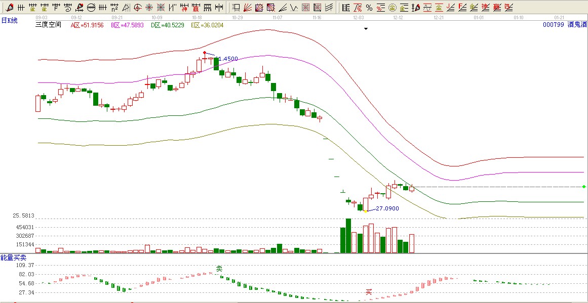 酒鬼酒用三度空間12.04日發(fā)出黃色見底信號,一路突破了E區(qū)沒以前處于D區(qū)壓力位置