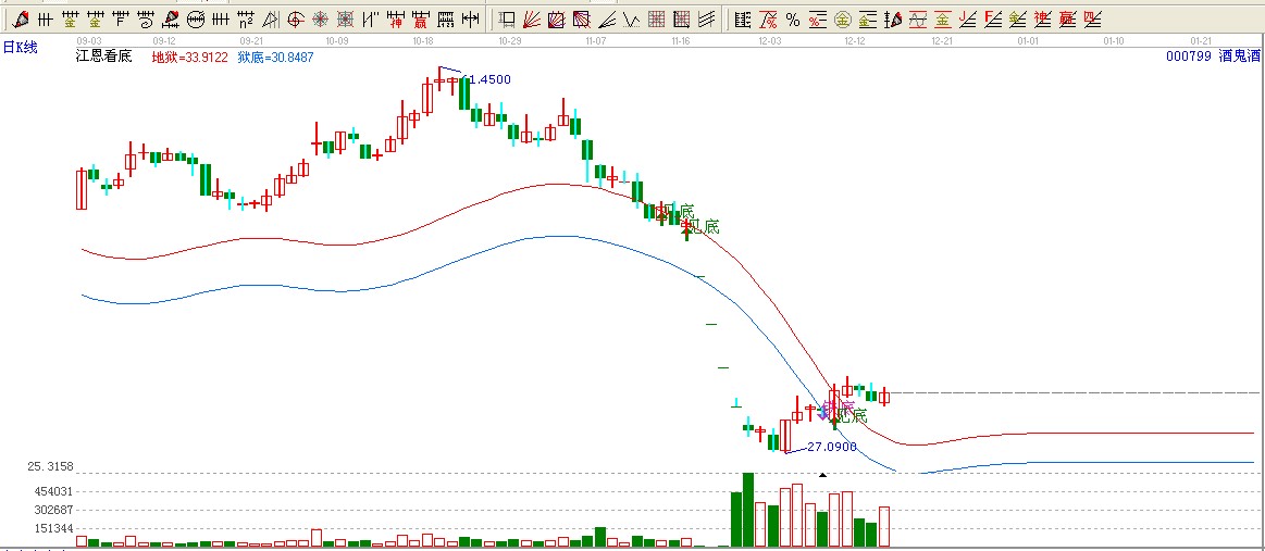 酒鬼酒用江恩看低工具在12.07日發(fā)出鐵底信號,觸及獄底在12.10日發(fā)出了見底信號一路上攻地獄上方開始了大躍進。