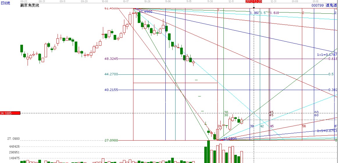 酒鬼酒用贏家角度線看盤:酒鬼酒目前處于角度線上方下一時間在12.20日角度線交匯處這里壓力34.3的位置