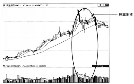 上圖是民生銀行(600016)的日K線圖和成交量,在股價(jià)上漲一大段后,主力已拉到目標(biāo)價(jià)位,然后快速拉高出貨。