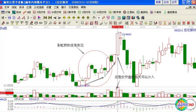 【形態(tài)分析】在個(gè)股建倉(cāng)的時(shí)候呈現(xiàn)震蕩走高的趨勢(shì),主力在震蕩建倉(cāng)中進(jìn)行洗盤操作,而且量?jī)r(jià)配合比較合理,主力在建倉(cāng)平臺(tái)整理的末端,逐步的進(jìn)行放量激活股價(jià),放量上漲突破阻力線,并在突破的時(shí)候形成圓弧狀的走勢(shì),形成小橋的形態(tài),就是“彩虹橋”的基本形態(tài);