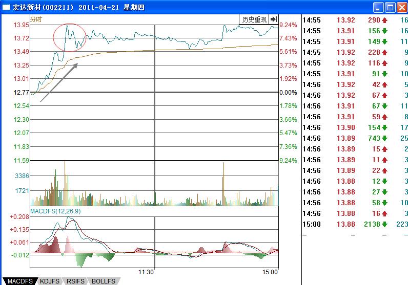 如圖宏達(dá)新材(002211)在2011年4月份的股價(jià)走勢(shì)變化,股價(jià)一直處于明顯的上漲趨勢(shì)中,而且在上漲的過(guò)程中出現(xiàn)的陽(yáng)線多于陰線的走勢(shì),4月8日的時(shí)候股價(jià)開(kāi)始了一根大陽(yáng)線的拉升走勢(shì),之后出現(xiàn)的回調(diào)形成了“彩虹橋”的基本走勢(shì)形態(tài),對(duì)應(yīng)的量能配合比較合理,形成的是量升價(jià)漲,價(jià)跌量縮的基本走勢(shì)形態(tài)。