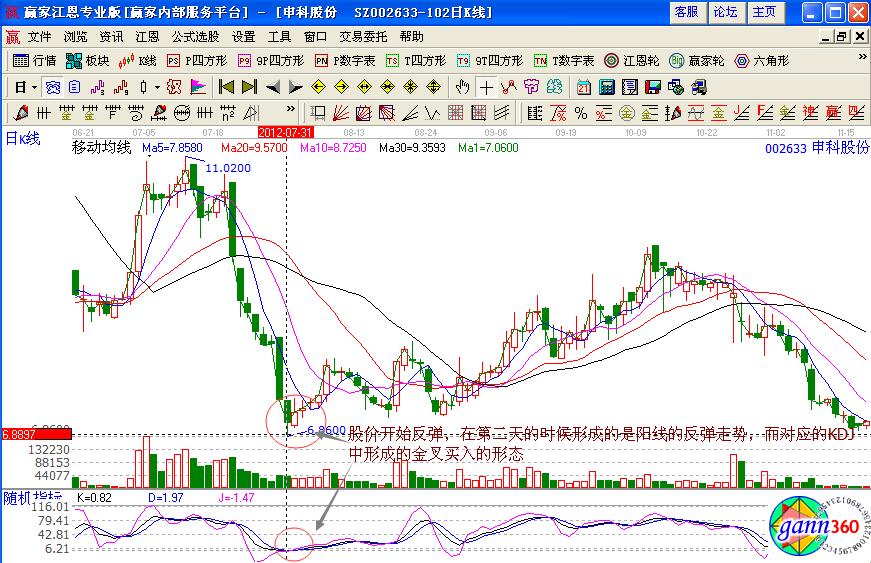 由于周線中KDJ的J值如果連續(xù)的處于負值,在反彈的時候更加有效,從該股后期的走勢可以看出,股價出現(xiàn)了反彈的走勢,對應(yīng)出現(xiàn)了九連陽的走勢,從6.7元的價格上漲到8.89元的價格,累計漲幅達到32%。