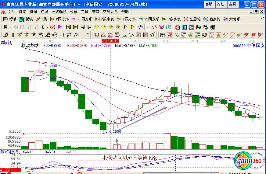 如果感覺對這一則實例的應(yīng)用不是很熟練,我們可以在觀察一則實例重點分析kdj指標的應(yīng)用,比如中信國安(000839)的周K線走勢圖,在2011年11月中旬的時候股價在9.87元的位置見頂之后,出現(xiàn)連續(xù)的急跌,形成雪崩式下跌形態(tài),是八連陰的K線組合,在出現(xiàn)第6根陰線的時候,其kdj的J值是-0.27,而且連續(xù)三周出現(xiàn)的都是負值,而且在第9周的時候,收出陽線,說明多頭開始改變被動的局面,投資者可以考慮逢低介入搶注反彈。