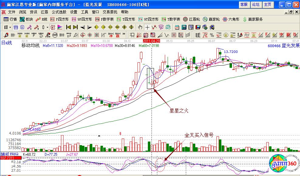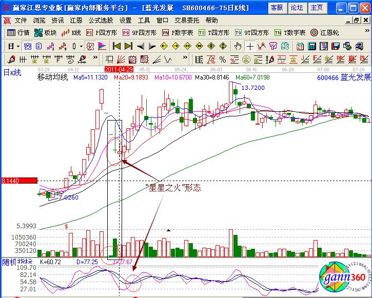 咨詢:13333833889無論是在下跌的走勢行情中還是上漲的走勢變化中,十字星可以說都是變盤的信號,特別是用股票行情軟件在大跌行情中分析的“星星之火”形態(tài),就是意味著股價筑底已經(jīng)完成,是反彈上漲的征兆。接下來我們就通過藍(lán)光發(fā)展的實例進(jìn)行分析。