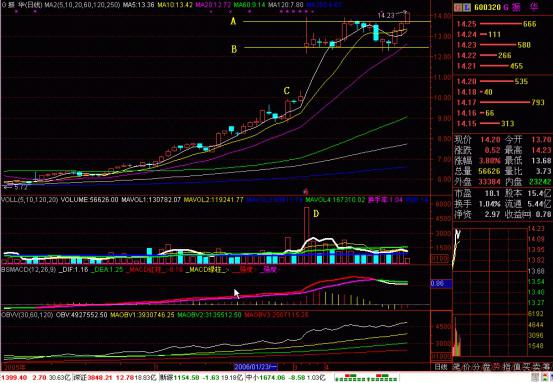 股改后復(fù)牌的個(gè)股,其價(jià)格與股改前的收盤價(jià)會(huì)有“斷裂”,由于最近大盤走高,大部分個(gè)股有補(bǔ)漲,于是頻頻出現(xiàn)“跳空缺口”。復(fù)牌當(dāng)日,還會(huì)出現(xiàn)巨量,如(圖一)中D處。你能判斷莊家的意圖嗎?巨量是拉高出貨?還是繼續(xù)收集籌碼?除非你看“靈穩(wěn)榜”,直接看清楚主動(dòng)性買入量的增加情況,否則你是很難準(zhǔn)確判斷的。