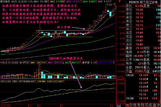 特別提醒如果是某種基本面變化原因?qū)е碌耐E疲坏?fù)牌后出現(xiàn)巨量跳空K線的,一般都是主力的原因,有的時(shí)候是主力乘混亂建倉,而有的時(shí)候是主力借機(jī)出貨。這樣我們可以通過OBV能量潮來輔助判斷一下,再把跳空后的股價(jià)高低收盤價(jià)框起來,形成一個(gè)懸空K線群,觀察股價(jià)是向哪個(gè)方向突破,也就知道主力在干什么了,只要主力突破的方向是向上,我們就基本可以跟進(jìn)了!
