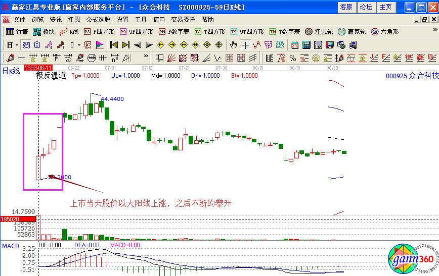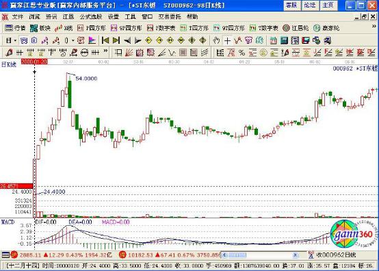 如下圖案例*ST東鉭(000962)在2000年1月20日上市,開盤價24.4元便成為最低價,當日強勢上攻,以幾乎最高價33.08元報收,成交4500萬股,約占流通盤6500萬股的70%,明顯屬于主力資金的拉高建倉行為,第二天低開高走,以光頭的陽線報收。至此,可基本確定為一頭短線瘋牛,投資者即可及時跟進,其后短短數(shù)天升幅高達50%。