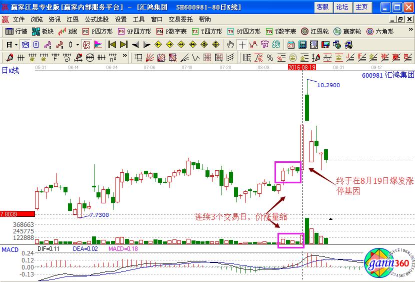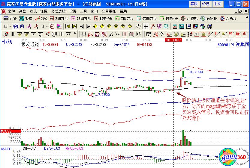 如圖匯鴻集團(600981)在極反通道中的走勢形態(tài),在2016年8月份的時候,股價一直處于生命線的附近運行,類似與橫盤整理的形態(tài)(股票橫盤是什么意思),之后繼續(xù)觀察其股價的走勢變化,可以看出在8月15日的時候,股價站上了生命線的上方,進入強勢區(qū)域運行,而且對應的macd指標形成的是金叉買入的操作信號,投資者可以在該位置進行買入操作,等待后市的上漲形態(tài)。