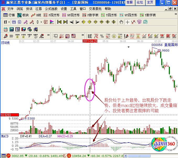 然而實(shí)戰(zhàn)中的操作技巧,還需要通過實(shí)例進(jìn)行分析,如圖皇庭國(guó)際(000056)在2011年4月29日的股價(jià)走勢(shì),處于一波上漲的趨勢(shì)中,突然出現(xiàn)了一根下跌的陰線,對(duì)應(yīng)的成交量縮小,但是macd的紅柱線卻在不斷的拉長(zhǎng),所以該形態(tài)的下跌走勢(shì),有可能是假陰線,也就是假的下跌形態(tài),目的是想要投資者出局,這個(gè)時(shí)候投資者要注意及時(shí)的觀察其走勢(shì)變化,后市的看漲行情嚴(yán)重。
