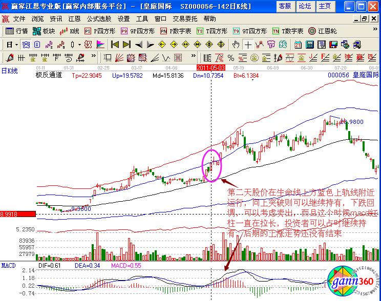 在極反通道中進(jìn)行分析,在5月3日的時(shí)候,股價(jià)已經(jīng)出現(xiàn)了上漲的走勢(shì),說明前一天的陰線是假摔的現(xiàn)象,此時(shí)的股價(jià)在藍(lán)色上軌線的位置運(yùn)行,如果向上突破可以繼續(xù)持有,下跌回調(diào)的話,可以考慮賣出,而且這個(gè)時(shí)候?qū)?yīng)的macd紅柱線在不斷的拉長(zhǎng),在出現(xiàn)逐漸縮短的形態(tài)時(shí)候,投資者要及時(shí)的賣出。
