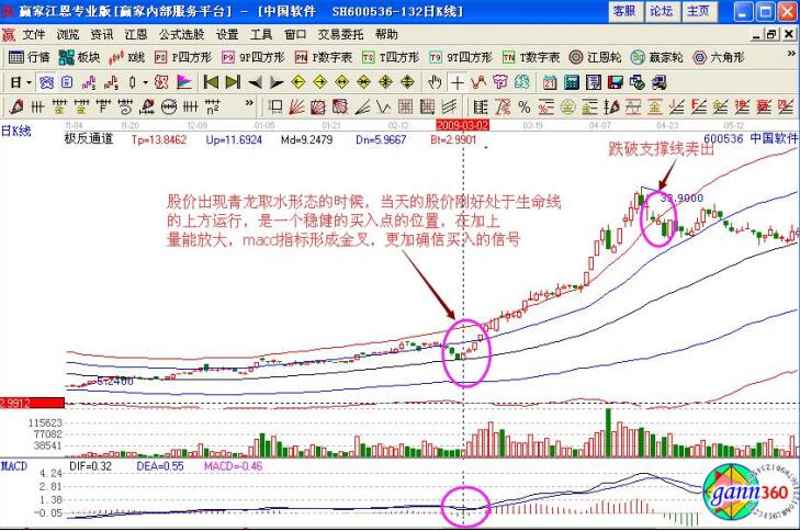 同時(shí)對(duì)比在極反通道中的走勢形態(tài),股價(jià)在3月2日的時(shí)候剛好處于生命線的上方,是強(qiáng)勢運(yùn)行的信號(hào),而且量能微微縮小,macd指標(biāo)形成金叉走勢,之后的量能逐漸的放大,是一個(gè)穩(wěn)健的買入點(diǎn),之后股價(jià)向上突破了藍(lán)色上軌線,并突破紅色外軌線運(yùn)行,在股價(jià)跌破紅色外軌線的時(shí)候,投資者要考慮賣出的操作。